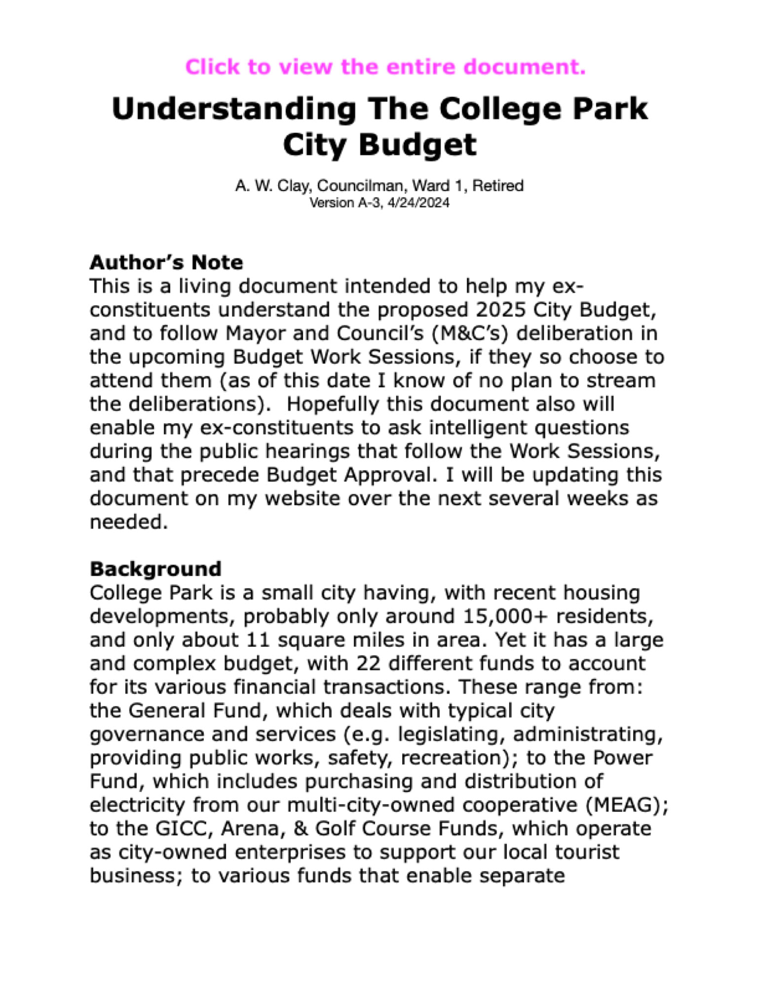 For your convenience, in the text below I have inserted links directly to relevant budget material on the City website. However, if these links fail, you can always hunt for the material on the City Budget Page of the City website. Last year I wrote a tutorial on “Understanding The College Park City Budget”. Although it contains references to last year’s budget, some of the text is still relevant in understanding the budget. I will update it when and if this year’s budget process becomes stable and contains more detail. The initial few pages is further below on this webpage. Click on the first page to view the current version of the PDF document.